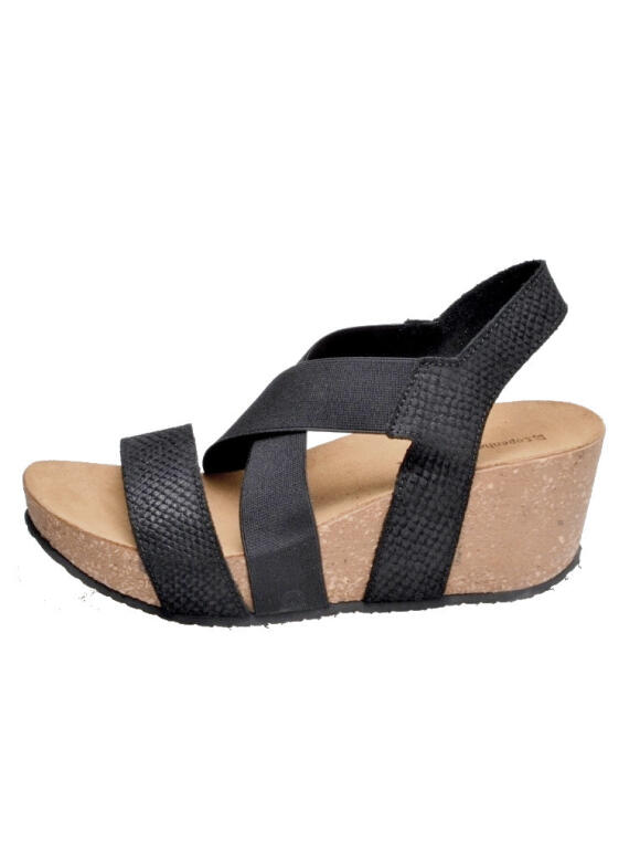 Stasia sandal fra Copenhagen shoes. Sandalen har kilehæl og plateau bund med en højde på ca. 7 cm. Sorte krydsede elastik bånd over vristen og snake præget sort skind henover tæerne og rund omkring anklen. Normal til den lidt store side i størrelsen. Sidd (Læs mere)