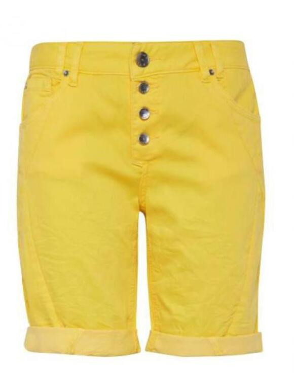 Rosita shorts fra Pulz. Shortsen er med fast linning, 5 lommer og synlig knaplukning. Smal model med moderat lav talje og lækker strech. Der er lille opslag i benene som sagtens kan foldes ned så shortsen bliver 5 cm længere. Flot klar gul sommer farve. 6 (Læs mere)