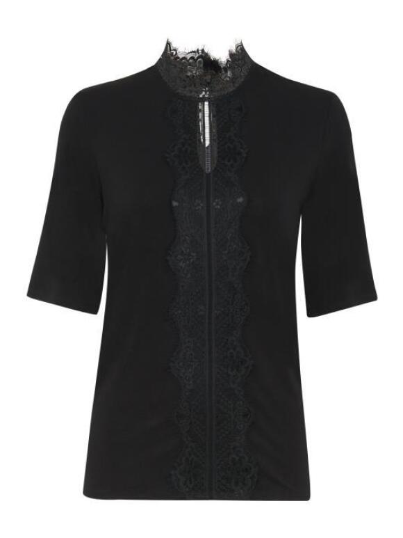 Pulz Trisse bluse med korte ærmer og blonde påsat ned foran. Blonde kant i halsen med knaplukning i nakken. 95 % viscose, 5 % elasthan. Vask ved 3 grader. Max krymp 5 % (Læs mere)