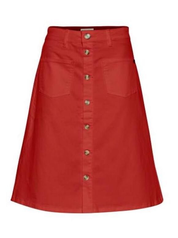 Ditte nederdel fra Pulz i retro 70èr look. Nederdelen har fast linning, knaplukning hele vejen ned foran og erskåret i A facon. To påsatte lommer foran. Flot coral rød farve. 65 % bomuld, 33 % polyester og 2 % elastan. Vask ved 30 grader. (Læs mere)