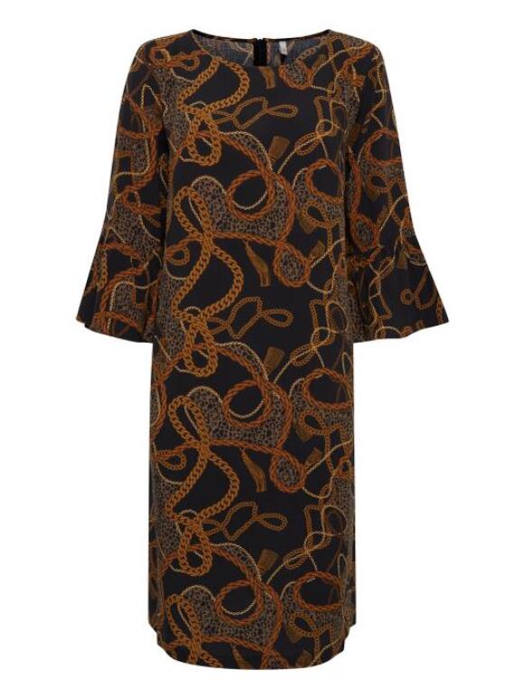 Pulz Zola kjole med rund hals og lynlås lukning i ryggen. Ærmer i trekvart længde med trompet flæse forneden. Kjolen er lige op og ned i faconen og har en længde ca. til knæene. Sort bundfarve med kædeprint i gyldne farver. 100 % viscose. Vask ved 30 grad (Læs mere)