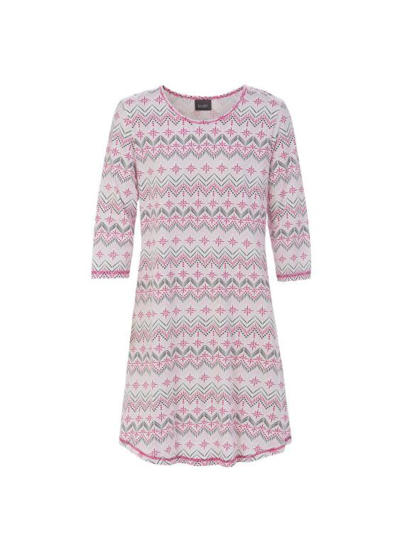 Trofè natkjole med rund hals og trekvart ærmer. Længde ca til knæene. Flot mørk lavendel farver i isblomster lignende mønster på råhvid bund. 100 % bomuld. Vask ved 60 grader. (Læs mere)